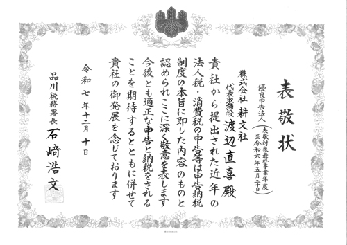 石崎浩文 品川税務署長(右)ら一行3人が㈱耕文社を訪れ優良申告法人表敬状を授与してくださった。 渡辺(左)は感激の面持ちで拝受した。